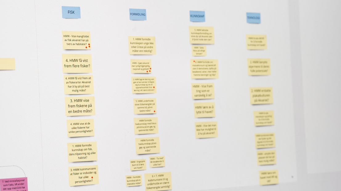 Med bakgrunn i analysen, startet idéarbeidet. Gruppen benyttet et utvalg metoder fra Google Designsprint, deriblant «Hvordan kan vi» (How Might We’s), sprintspørsmål og konseptskisser basert på disse.